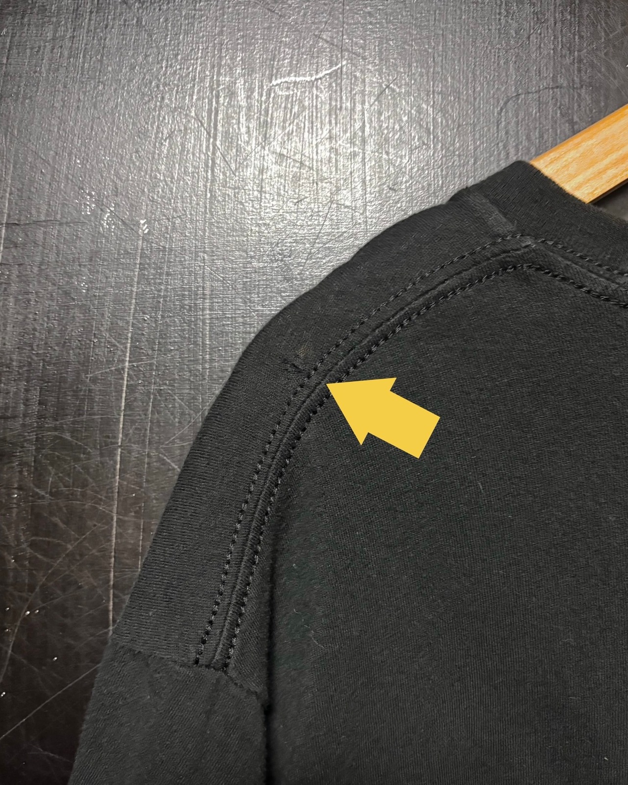 経年なりの着用感、ブラックボディ特有の色落ち〜色ムラ、フロントにプリントの写り?、左肩に小穴のリペア、ハンガー跡(洗濯〜着用を繰り返すうちに目立たなくなります)がございますが