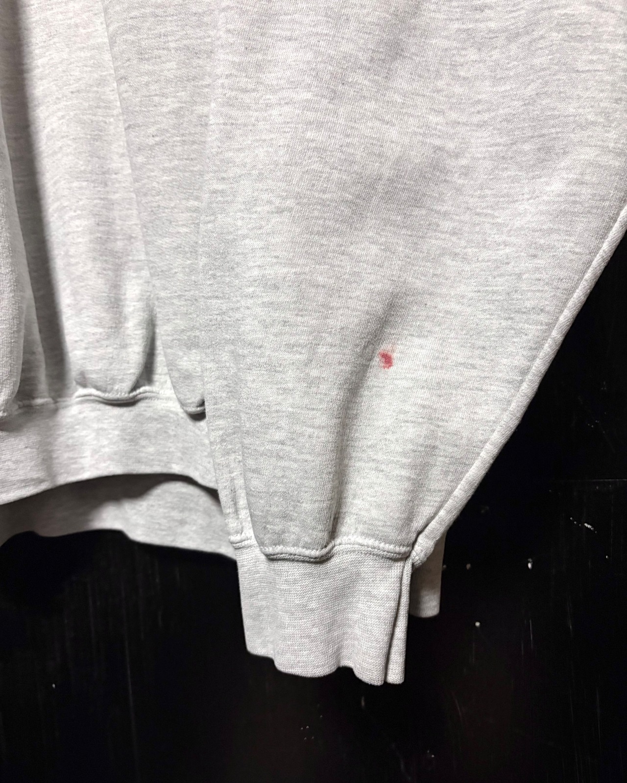 経年なりの着用感、全体的に生地痩せ、バック右肩付近にピンホール、左袖口付近にインクの付着がございますが
