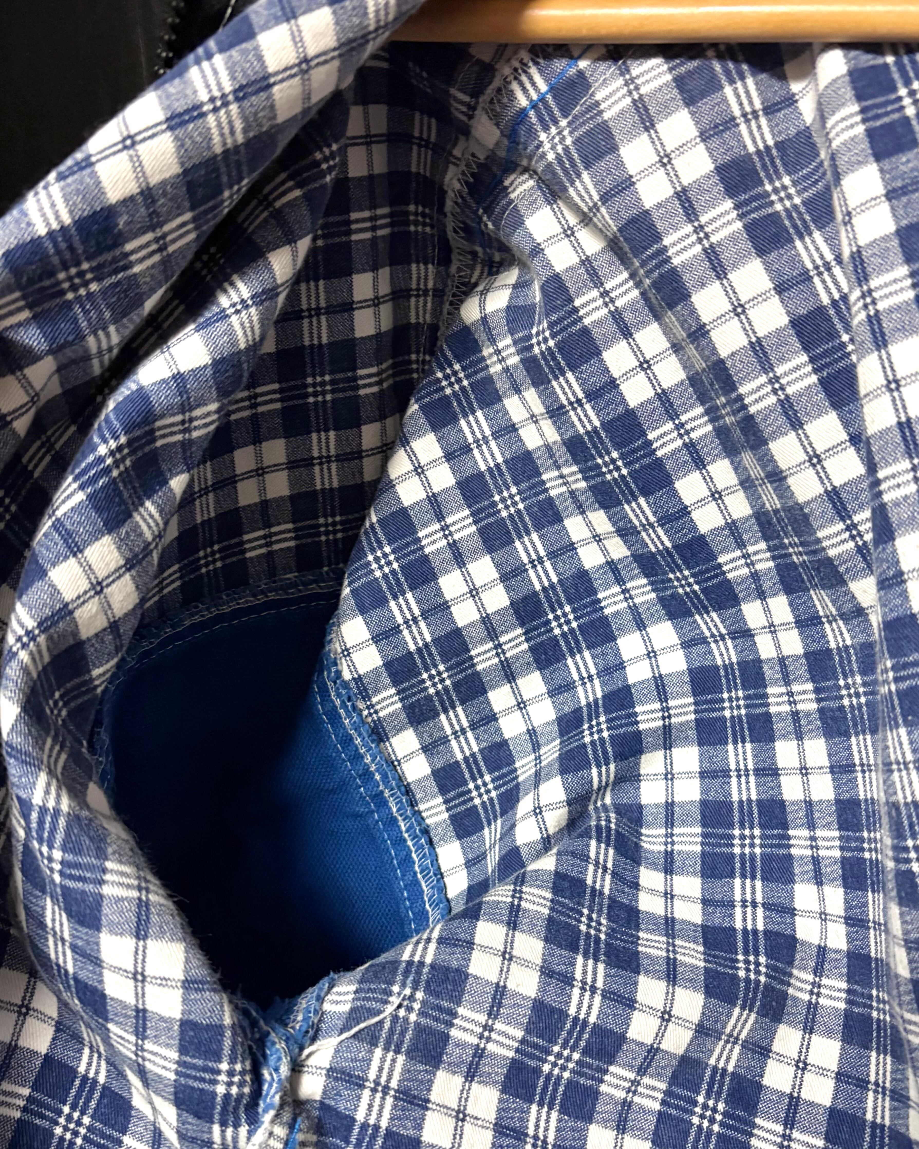 経年なりの着用感、色落ち〜色ムラ、薄シミ、左襟先にステッチ抜けがございますが