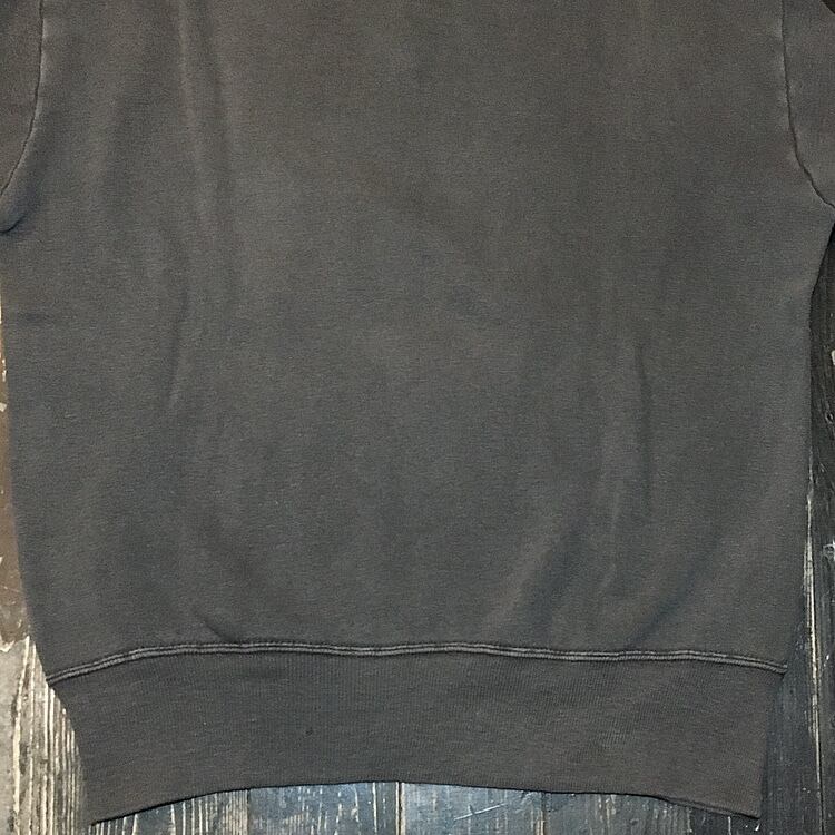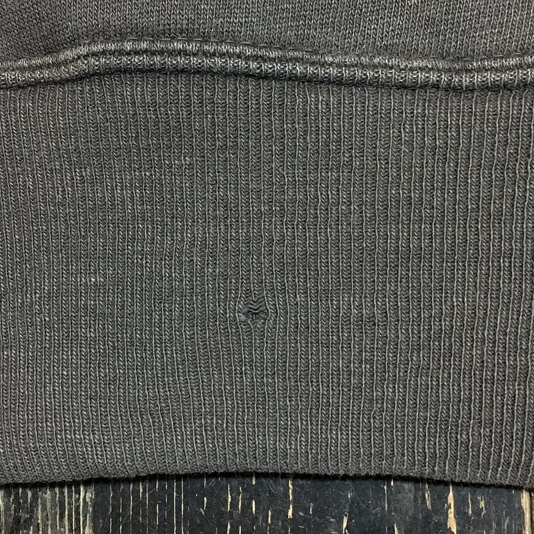 経年なりの使用感、 色褪せ、右肩首リブ付近にホツレ〜小穴、バックの裾リブ中央付近にピンホール、左袖口リブ縫い付け部付近にホツレ等ございますが