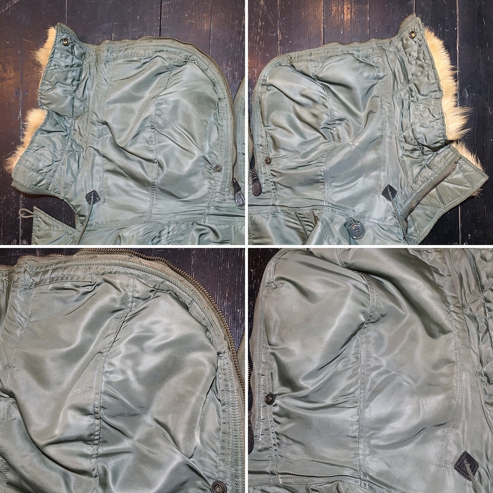 年代なりの使用感、ボディその他に薄汚れ〜オイルシミ〜シミ、フロント第4ボタンに交換、フードの内ボア首回り付近に若干のパイル潰れ、裾リブ〜袖リブにホツレ〜裂け〜リペア、左右袖口付近にピンホール等ございますが