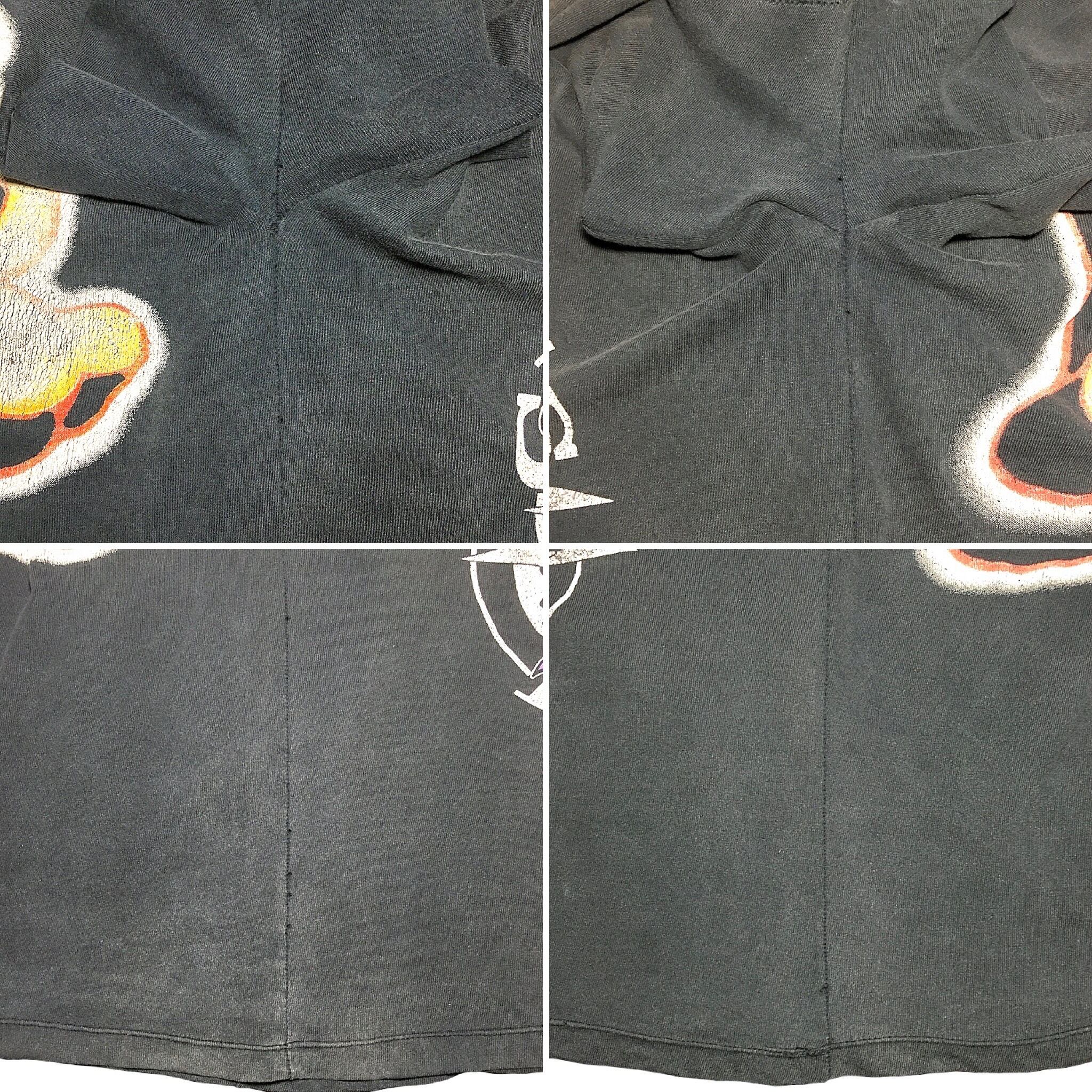 経年なりの使用感、タグ欠損、フェード、ボディ〜脇下に小穴〜ピンホール、首周りにピンホール〜スリ切れ、裾に擦り切れ、プリントにスレ等ございますが